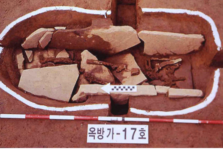 在支石墓的墓室发现了磨制石剑或磨制石镞的例子很多.其出土位置多在头部,有时也在腹部.因此把尸体看成在集团间战争中牺牲的人.根据出土遗物和嵌在人骨的考古学资料,把它看成为执行战斗任务而战死的战士的功勋墓.在我国曾发现没有头颅的人骨,在日本发现嵌在头骨里的青铜和磨制石剑.